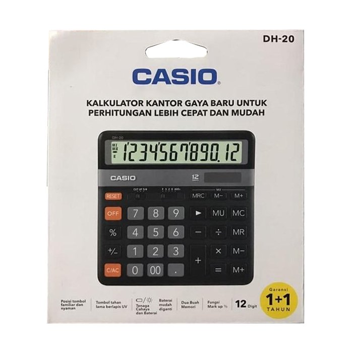 100% original, baru, segel dan garansi resmi Casio IndonesiaKalkulator merek Casio ini merupakan merek yang telah banyak dipakai orang-orang karena keawetan dan daya tahannya. Kalkulator Casio DH 20 Specifications :- Desktop Type- 12 digits- Regular percent (Regular percentage calculations).- Solar & Battery (Solar powered when light is sufficient, battery powered when light is insufficient).- Extra Large display (Larger display makes more data easier to read.)- Plastic keys (Designed and engineered for easy operation.)- Mark-up (All the mark-up capabilities of an adding machine for simplified cost and profit calculations).- 2 buah memori.- Terdapat tombol RESET. (Menekan RESER akan menghapus semua konten memori.- Jauh lebih tahan lama. (Tombol berlapis UV sehingga tidak mudah pudar).- Tombol di rancang untuk kenyamanan dan posisi yang familiar, mempermudah perhitungan tanpa melihat tombol.