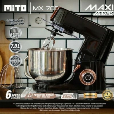 Accecories : Dough Hook, Whisker, Beater, Tutup anti splash