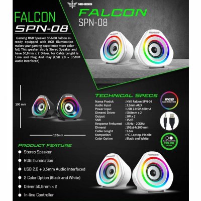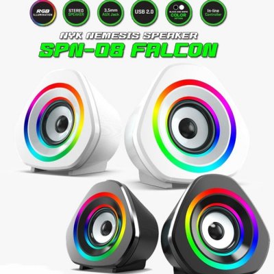 Gaming RGB Speaker SP-N08 Falcon already equipped with RGB Illumination makes your gaming experience more colorfull. This speaker also is Stereo Speaker and have 50,8mm x 2 Driver. For Cable Lenght is 1.6m and Plug And Play (USB 2.0 + 3.5MM Audio Interfaced).
